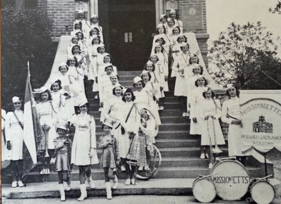 Young women of Blessed Sacrament Academy stand proudly in front of the original convent building that once served as both home and classroom. At the time, BSA was an all-girls academy rooted deeply in the community.